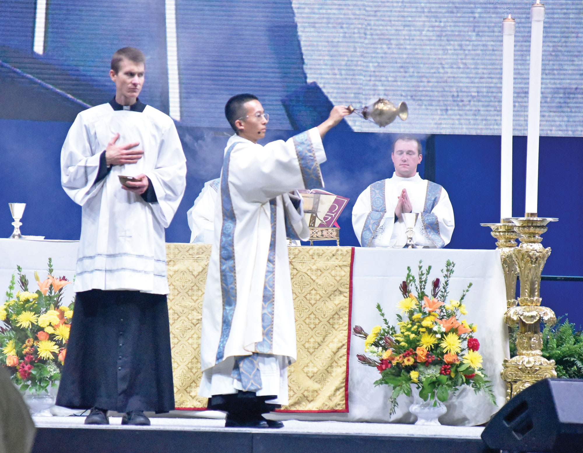 Transitional Deacon Khaing Thu incenses the 16,000 Catholic teenagers worshipping on Nov. 22 at the closing Mass of the National Catholic Youth Conference at Lucas Oil Stadium in Indianapolis. Seminarian Casey Deal, left, assists Deacon Thu. At right, transitional Deacon Samuel Hansen stands at the altar in the stadium. All are archdiocesan seminarians. (Photo by Sean Gallagher)