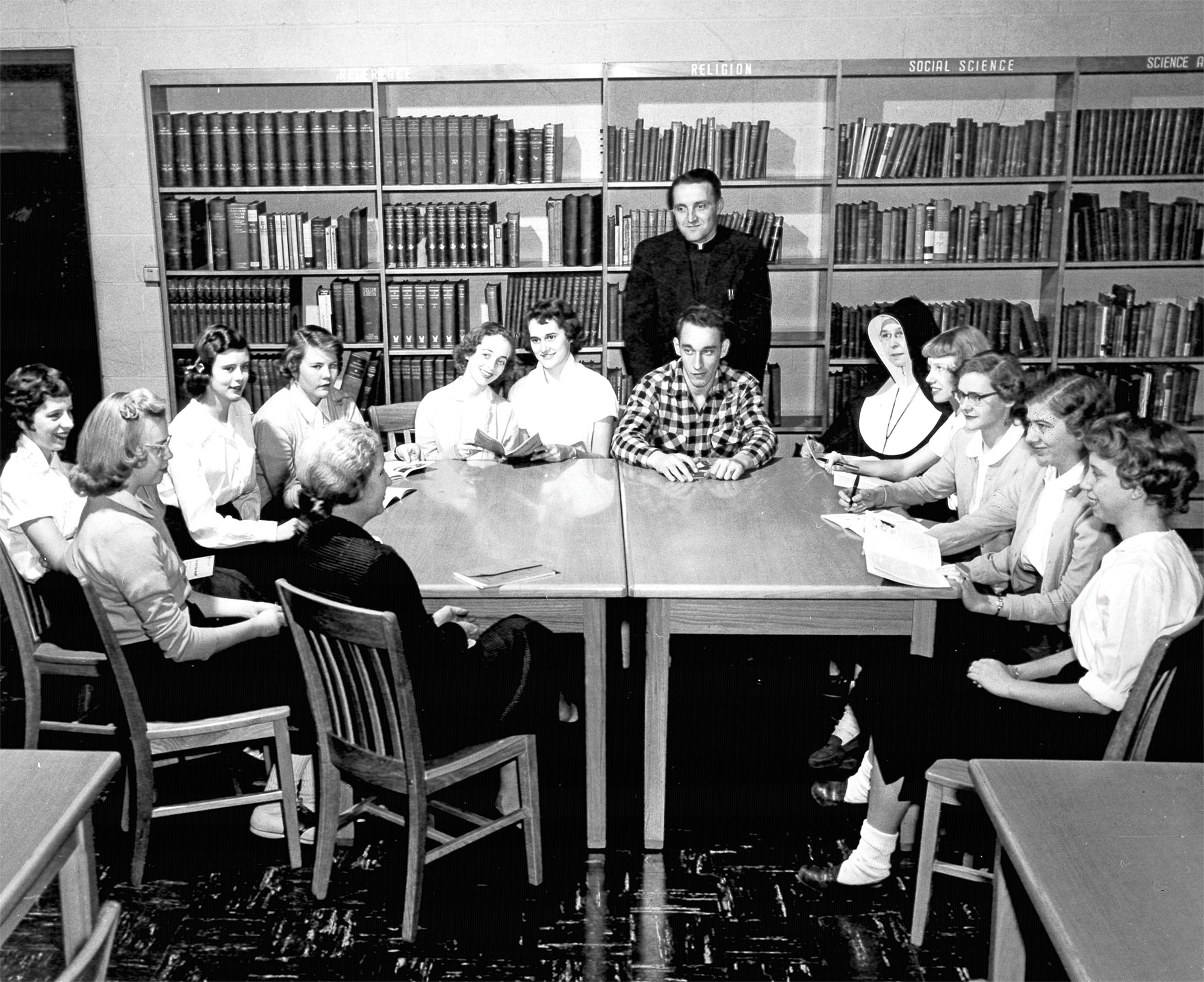 In this window from a church in the archdiocese, we see Jesus turn water into wine at the request of the Blessed Virgin Mary during the wedding at Cana. The parish where this window appears was established in 1837.Students at a former Catholic high school in Terre Haute appear in this photo with Fr. Joseph Beechem, principal. A member of the Sisters of Providence, who taught at the school, also appears in the group. This Vigo County high school operated from 1953-1977. Prior to 1953, there was a small Catholic high school for girls in Terre Haute, but no option for boys.