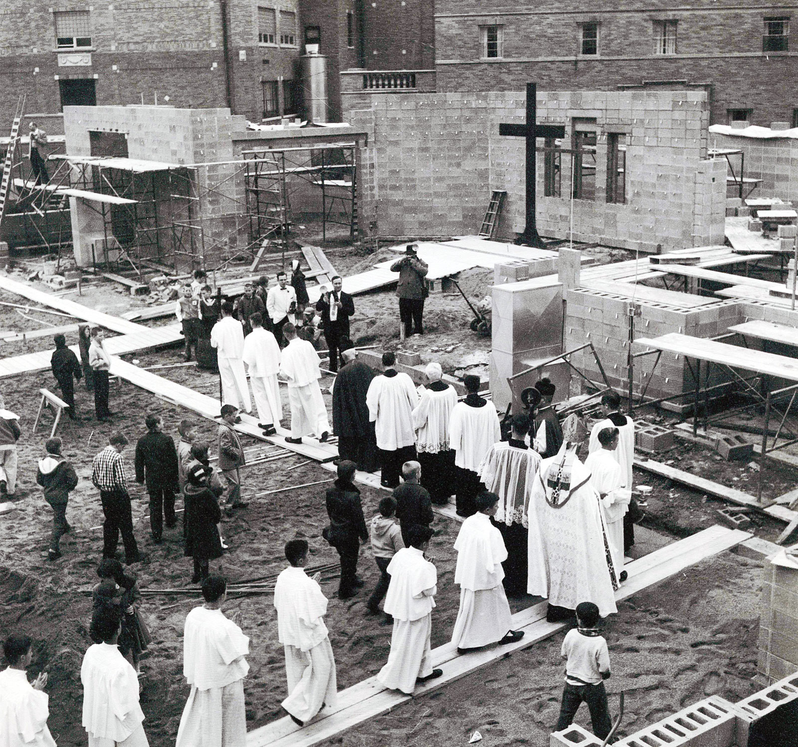 Archbishop Paul C. Schulte, priests and altar servers take part in a 1961 procession on the building site of St. Théresè of the Infant Jesus (Little Flower) Church in Indianapolis to bless the cornerstone of the east side faith community’s church. (Submitted photo)