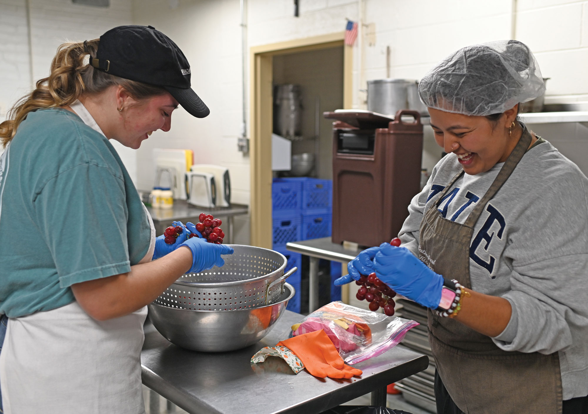 Therese Hauersperger, left, a member of the college student organization of St. John the Evangelist Parish in Indianapolis, and Leslie Venegas, a Fellowship of Christian University Students’ missionary at the parish, prepare food on Oct. 9 for the Cathedral Kitchen in Indianapolis. On Nov. 8, an open house and blessing will highlight recent Cathedral Kitchen restorations, including upgrades to electrical, plumbing and structural systems. (Photo by Emily Mastronicola)