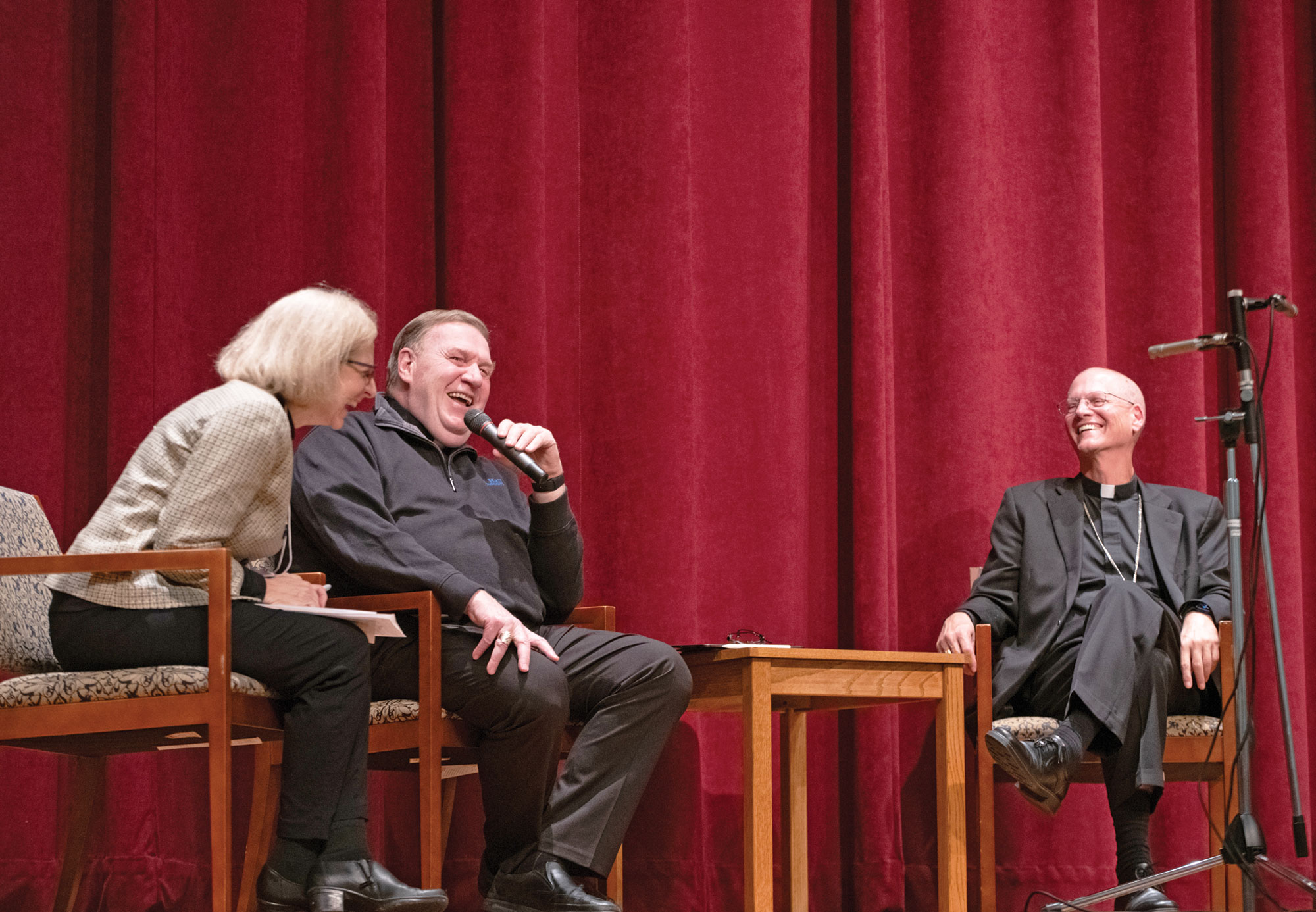 During a Nov. 5 session of a conference titled “Deepening Communion in a Polarized World” at Saint Meinrad Seminary and School of Theology in St. Meinrad, Cardinal Joseph W. Tobin, center, archbishop of Newark, N.J. and former archbishop of Indianapolis, is joined in laughter by conference facilitator Dr. Amy Uleman, left, and Seattle Archbishop Paul D. Etienne, right, formerly a priest of the Archdiocese of Indianapolis. (Photo courtesy of Saint Meinrad Archabbey)