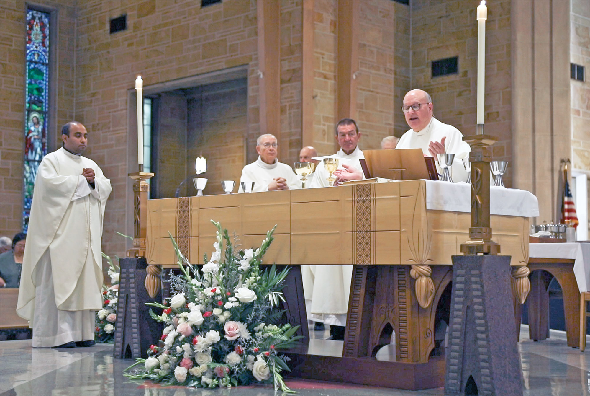 Msgr. William F. Stumpf, archdiocesan vicar general, right, prays the eucharistic prayer during a Sept. 13 Mass at St. Théresè of the Infant Jesus (Little Flower) Church in Indianapolis to celebrate the 100th anniversary of the Indianapolis East Deanery faith community’s founding. Concelebrating the Mass are, from left, Father Jude Meril Sahayam, Little Flower’s administrator, and retired Father Robert Gilday. Deacon Gary Blackwell, second from right, assists at the Mass. (Submitted photo by Caleb Baue)