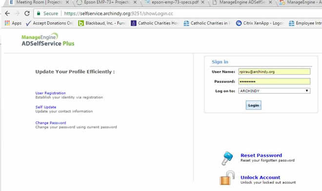 Option 2: Open a web browser and enter: https://selfservice.archindy.org:9251 which takes you to the page below.  Click “unlock account” or “reset password”