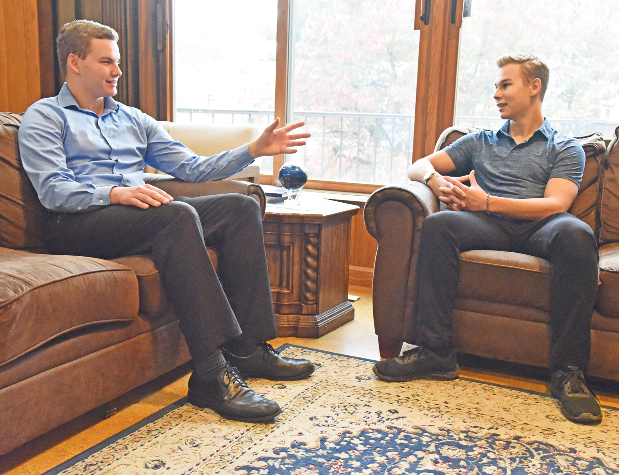 Seminarians Dominic Pavey, left, and Max Ecoff chat on Oct. 21 at Bishop Simon Bruté Seminary in Indianapolis where they are respectively in their second and first years of priestly formation. Both members of Our Lady of the Most Holy Rosary Parish in Indianapolis, they noted that seeing happy and holy priests and seminarians helped them in their discernment of a possible vocation to the priesthood. (Photo by Sean Gallagher)