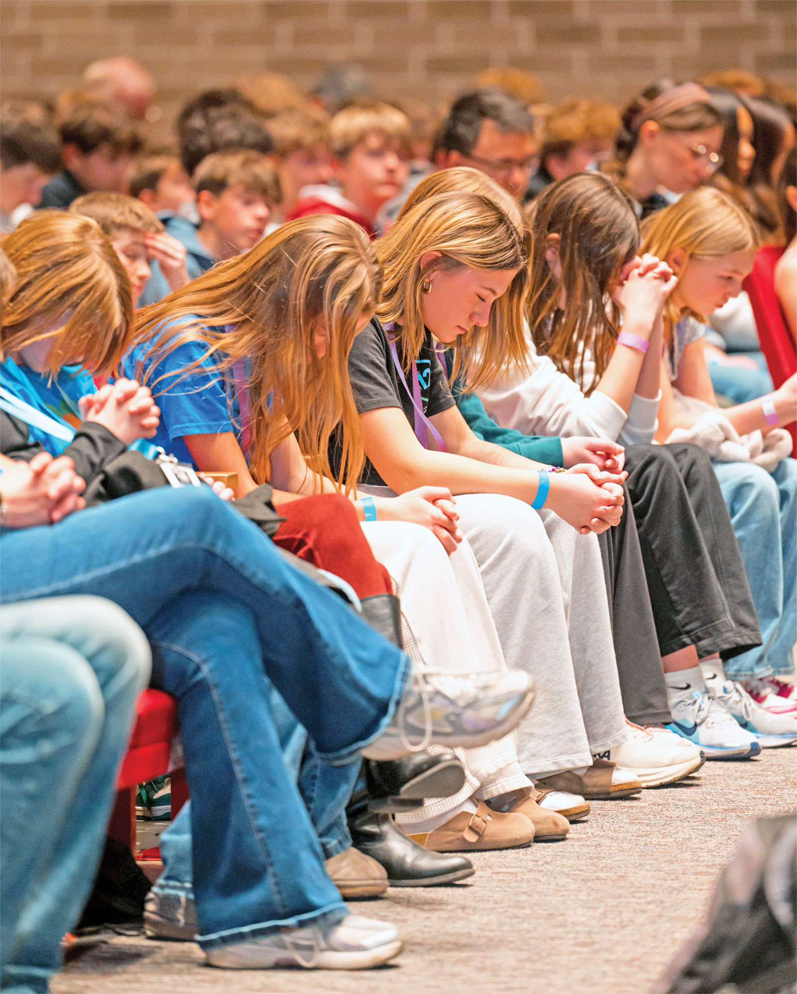Times of prayer and reflection were part of the Holy Fire event on Feb. 28 at the Pike Performing Arts Center in Indianapolis. It also included ice-breaking moments of a dance party and a performance by a magician. (Photo courtesy of Madeleine Budde)