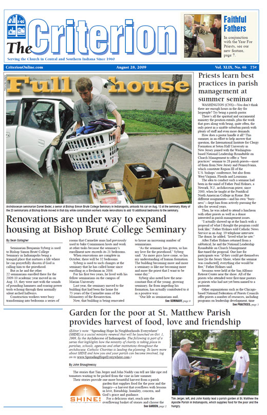 Seminarian Benjamin Syberg is used to Bishop Simon Bruté College Seminary in Indianapolis being a tranquil place. But as he and the other 22 seminarians enrolled there for the 2009-10 academic year moved in on Aug. 13, they were met with the sounds of pounding hammers and roaring power tools echoing through their normally silent arched hallways. (Page 1)