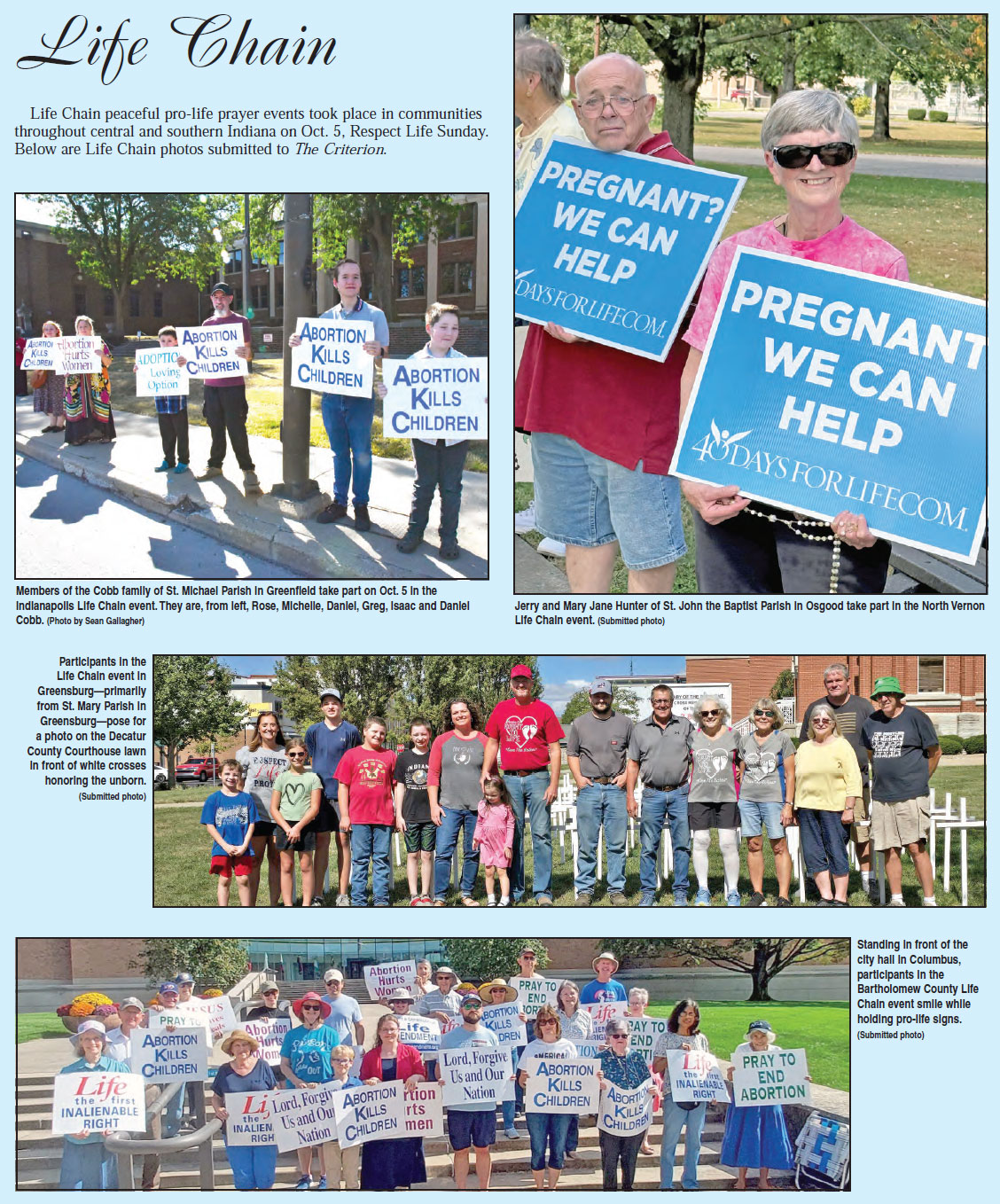 Life Chain peaceful pro-life prayer events took place in communities throughout central and southern Indiana on Oct. 5, Respect Life Sunday. Below are Life Chain photos submitted to The Criterion.