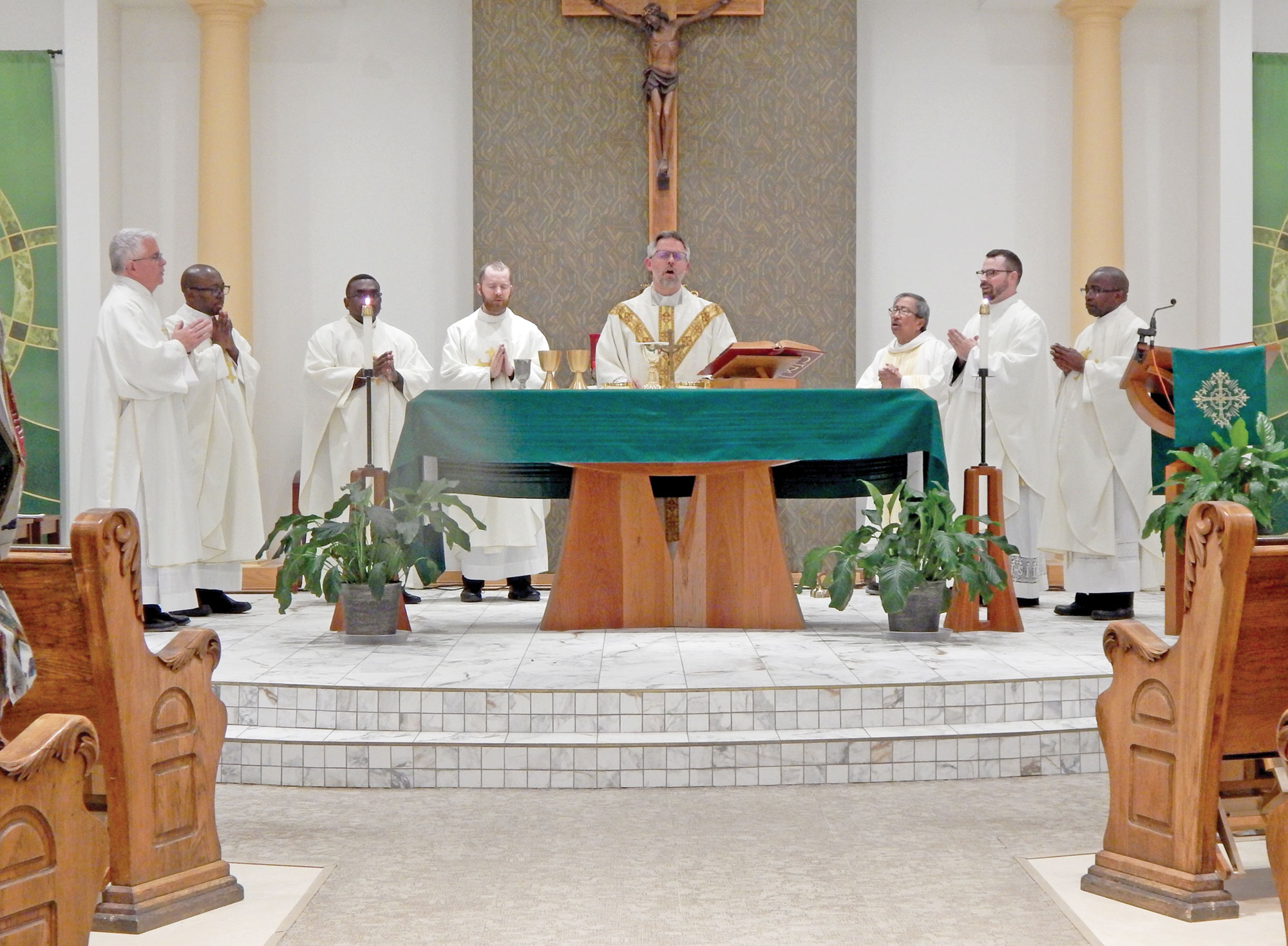 Clergy pray during a Nov. 3 Mass at Holy Angels Church in Indianapolis marking the feast of St. Martin de Porres. (Photo by Mike Krokos)