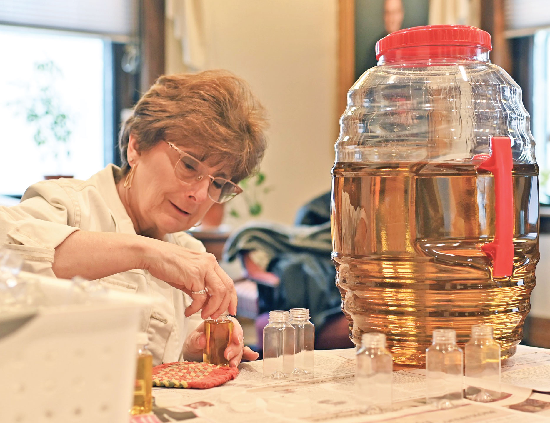 Keri Carroll, executive assistant at SS. Peter and Paul Cathedral Parish in Indianapolis, helps bottle chrism oil on March 16. The oil will be distributed to all archdiocesan parishes during the annual chrism Mass at the cathedral on March 31. (Photo by Emily Mastronicola)