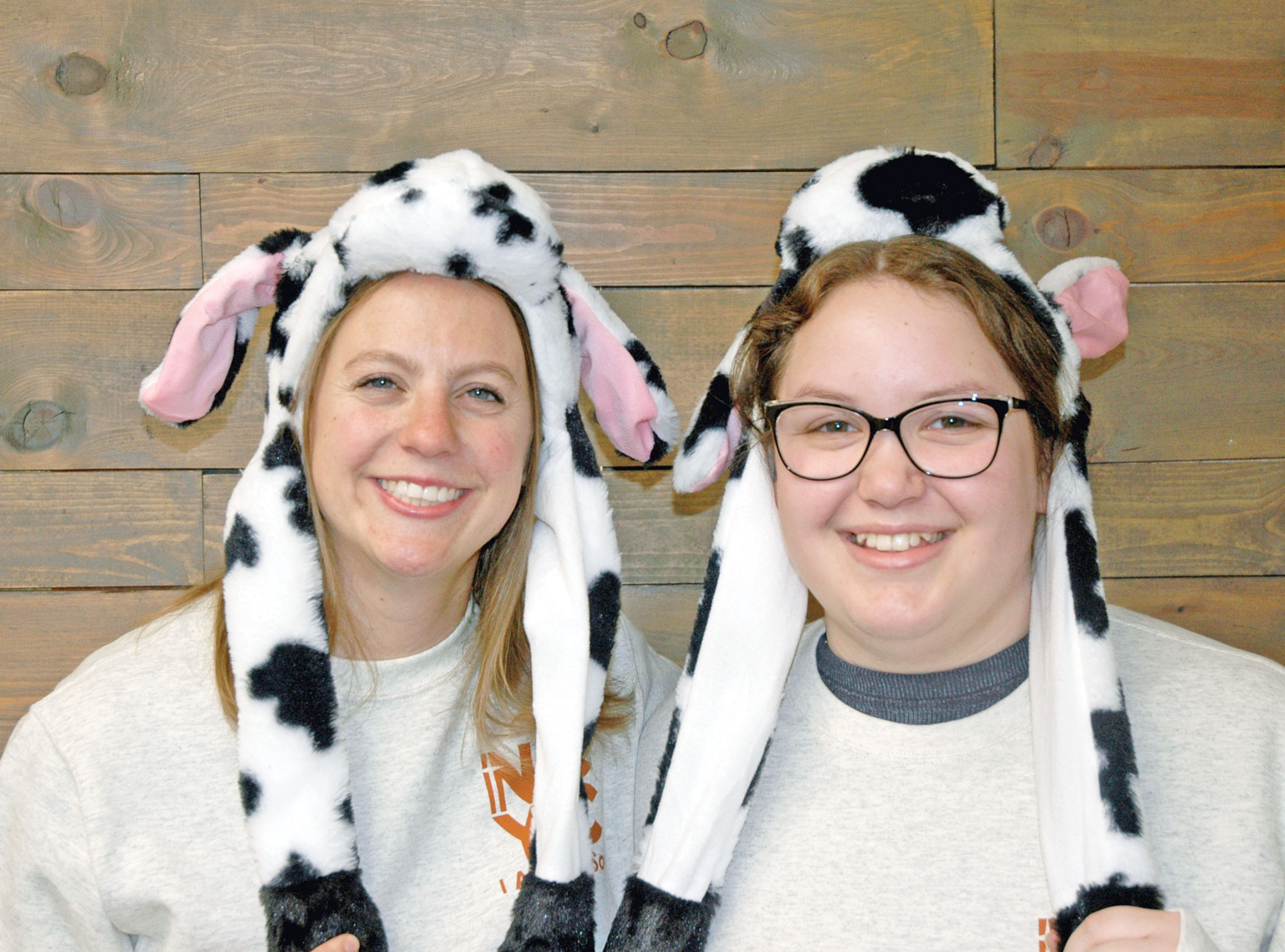 Rachel Gilman, left, director of youth ministry for the archdiocese, and Avery Shewmaker, coordinator of youth ministry for the archdiocese, model some of the spirit wear that the 1,526 youths in the archdiocese will wear during the National Catholic Youth Conference in Indianapolis on Nov. 20-22. (Photo by John Shaughnessy)