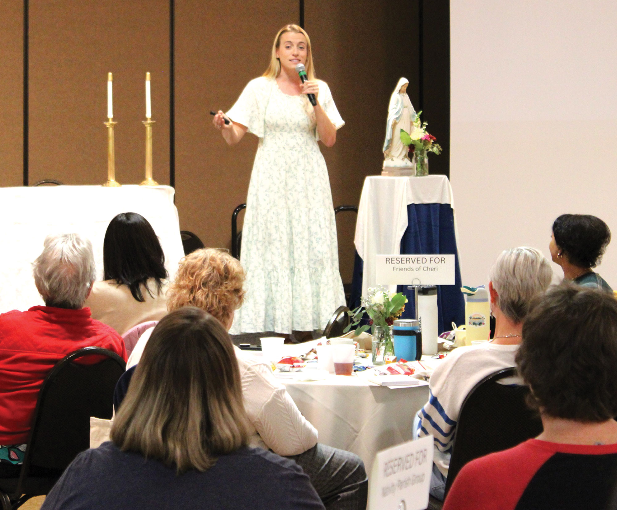 Catholic author and YouTube influencer Emily Wilson gives a talk during the Marian Authentic Women’s Conference at Primo Banquet Hall in Indianapolis on Oct. 25. (Submitted photo by Jennifer Lindberg)
