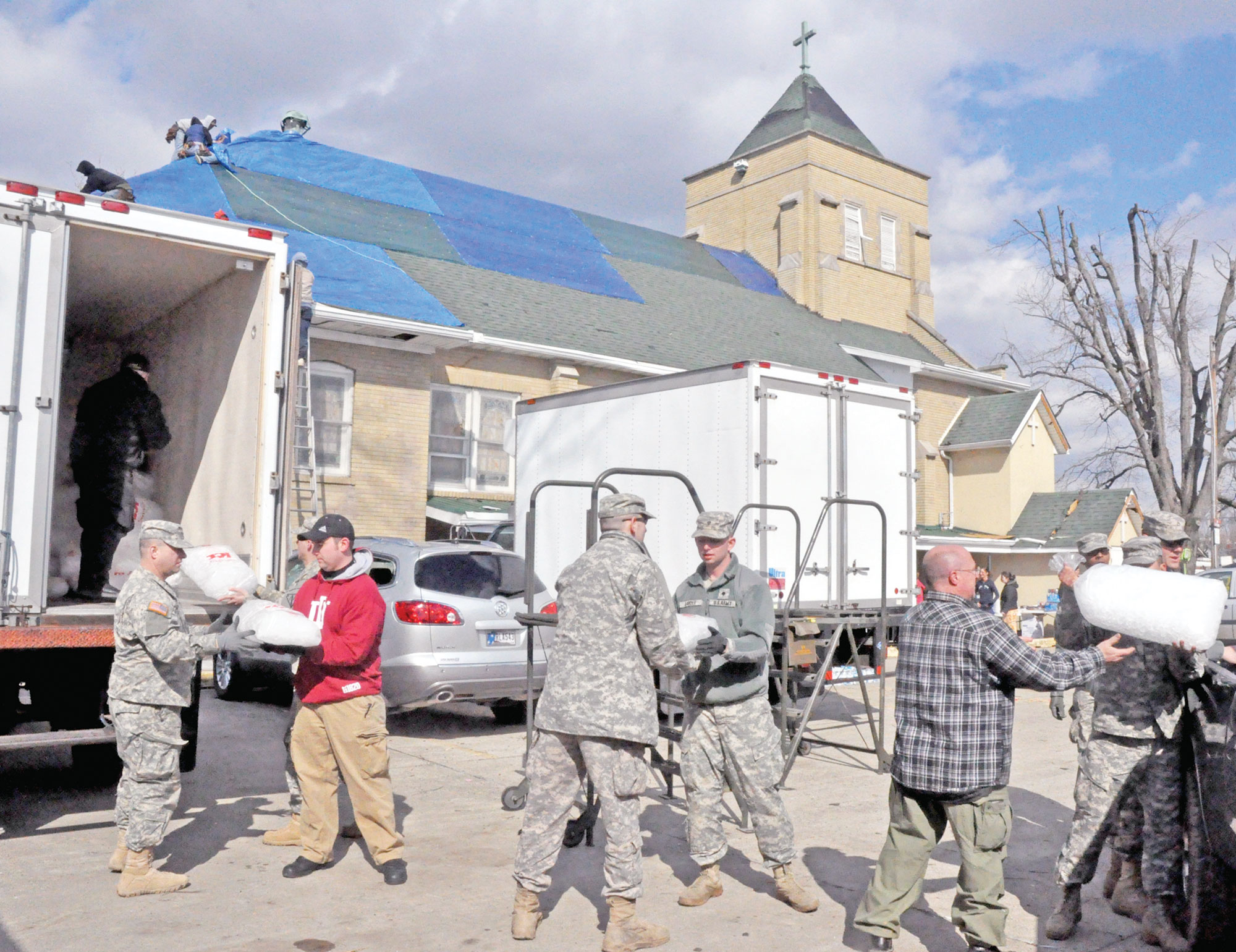 Members of the Indiana National Guard and other rescue workers haul donated ice to a refrigerated truck parked beside St. Francis Xavier Church in Henryville on March 3, 2012. The previous day, a tornado ravaged the southern Indiana town. As the coordinator of disaster preparedness and response for the archdiocese’s Catholic Charities, Jane Crady has responded to this natural disaster and many others in Indiana and around the United States in the past 20 years. (File photo by Sean Gallagher)