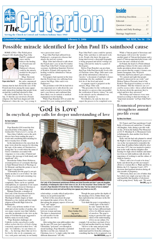 The latest edition of The Criterion has been printed and is on its way to subscribers. Below is a list of stories that will be appearing in the issue,along with regular features like Archbishop Buechlein's column, the editorial page and our newly redesigned events calendar.