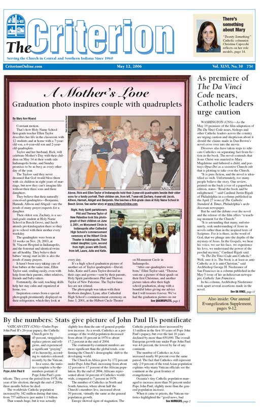 The latest edition of The Criterion has been printed and is on its way to subscribers. Below is a list of stories that will be appearing in the issue, along with regular features like Archbishop Buechlein's column, the editorial page and our redesigned events calendar.