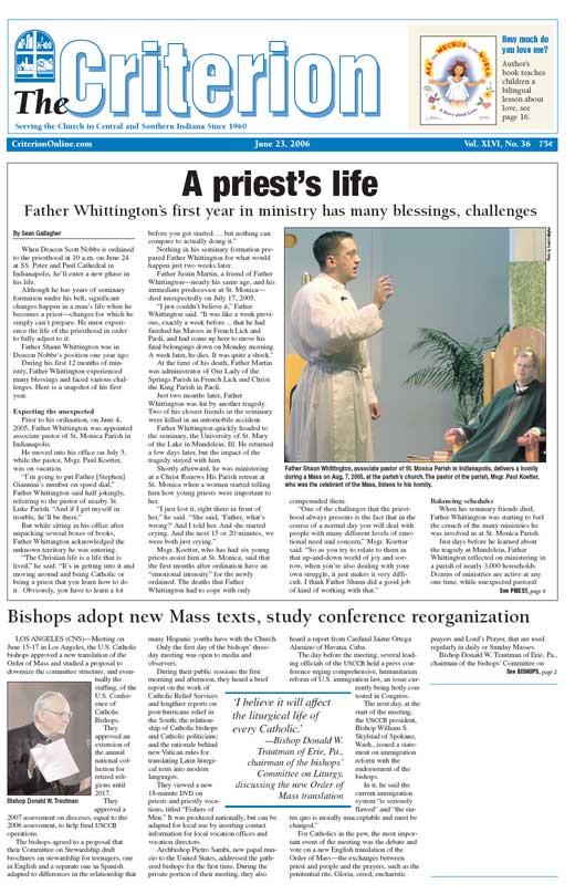 The latest edition of The Criterion has been printed and is on its way to subscribers. Below is a list of stories that will be appearing in the issue, along with regular features like Archbishop Buechlein's column, the editorial page and our redesigned events calendar.
