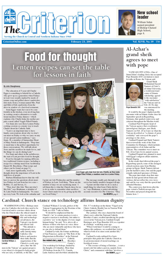 The latest edition of The Criterion has been printed and is on its way to subscribers. Below is a list of stories that will be appearing in the issue, along with regular features like Archbishop Buechlein's column, the editorial page and our events calendar.