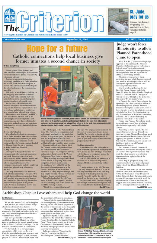 The latest edition of The Criterion has been printed and is on its way to subscribers. Below is a list of stories that will be appearing in the issue, along with regular features like Archbishop Buechlein's column, the editorial page and our events calendar.