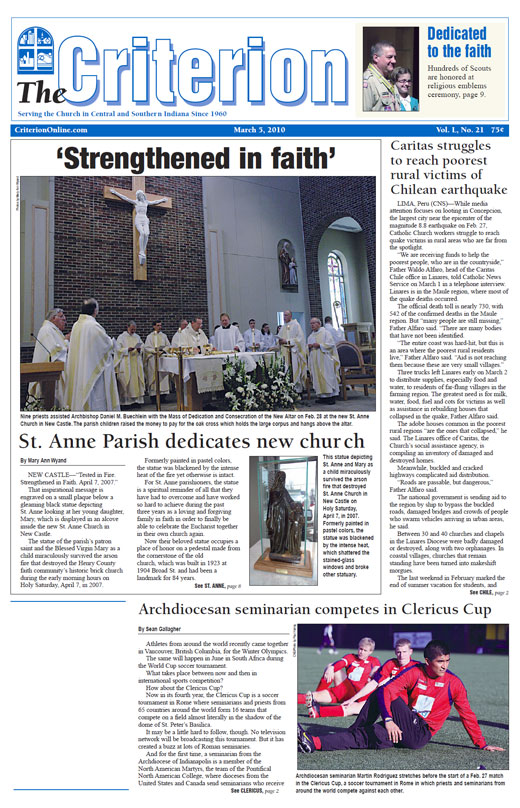 The latest edition of The Criterion has been printed and is on its way to subscribers. Below is a list of stories that will be appearing in the issue, along with regular features like Archbishop Buechlein's column, the editorial page and our events calendar.