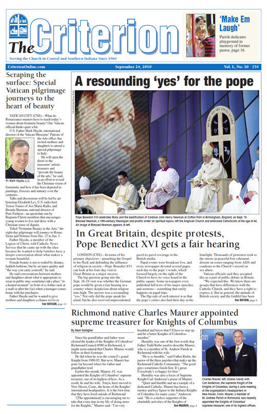The latest edition of The Criterion has been printed and is on its way to subscribers. Below is a list of stories that will be appearing in the issue, along with regular features like Archbishop Buechlein's column, the editorial page and our events calendar.