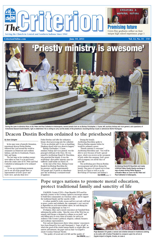The latest edition of The Criterion has been printed and is on its way to subscribers. Below is a list of stories that will be appearing in the issue, along with regular features like Archbishop Buechlein's column, the editorial page and our events calendar.