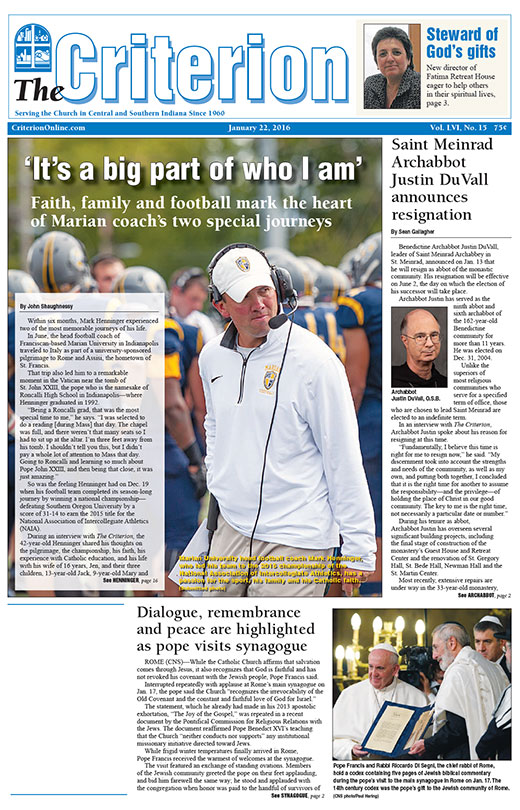 The latest edition of The Criterion has been printed and is on its way to subscribers. Below is a list of stories that will be appearing in the issue, along with regular features like Archbishop Tobin's column, the editorial page and our events calendar.