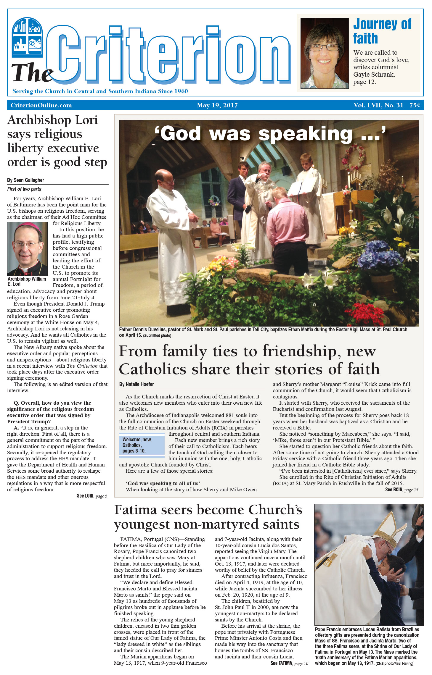 The latest edition of The Criterion has been printed and is on its way to subscribers. Below is a list of stories that will be appearing in the issue, along with regular features like the archbishop's column, the editorial page and our events calendar.