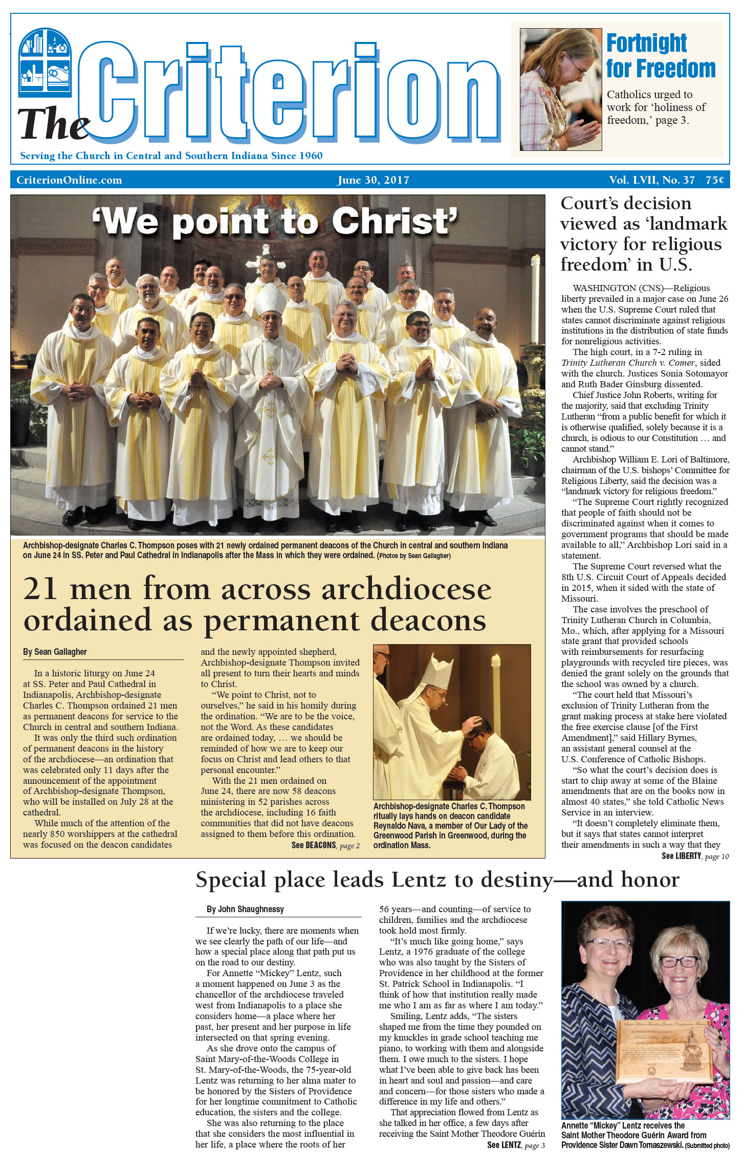 The latest edition of The Criterion has been printed and is on its way to subscribers. Below is a list of stories that will be appearing in the issue, along with regular features like the archbishop's column, the editorial page and our events calendar.