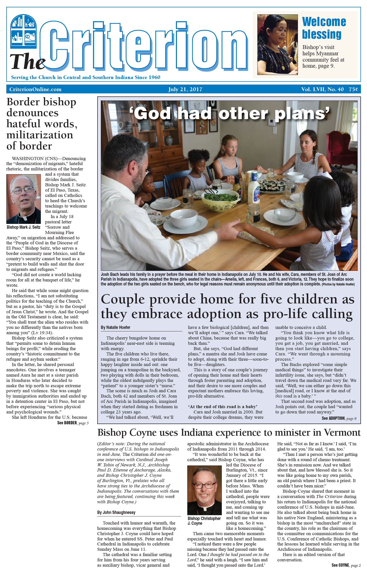 The latest edition of The Criterion has been printed and is on its way to subscribers. Below is a list of stories that will be appearing in the issue, along with regular features like the archbishop's column, the editorial page and our events calendar.