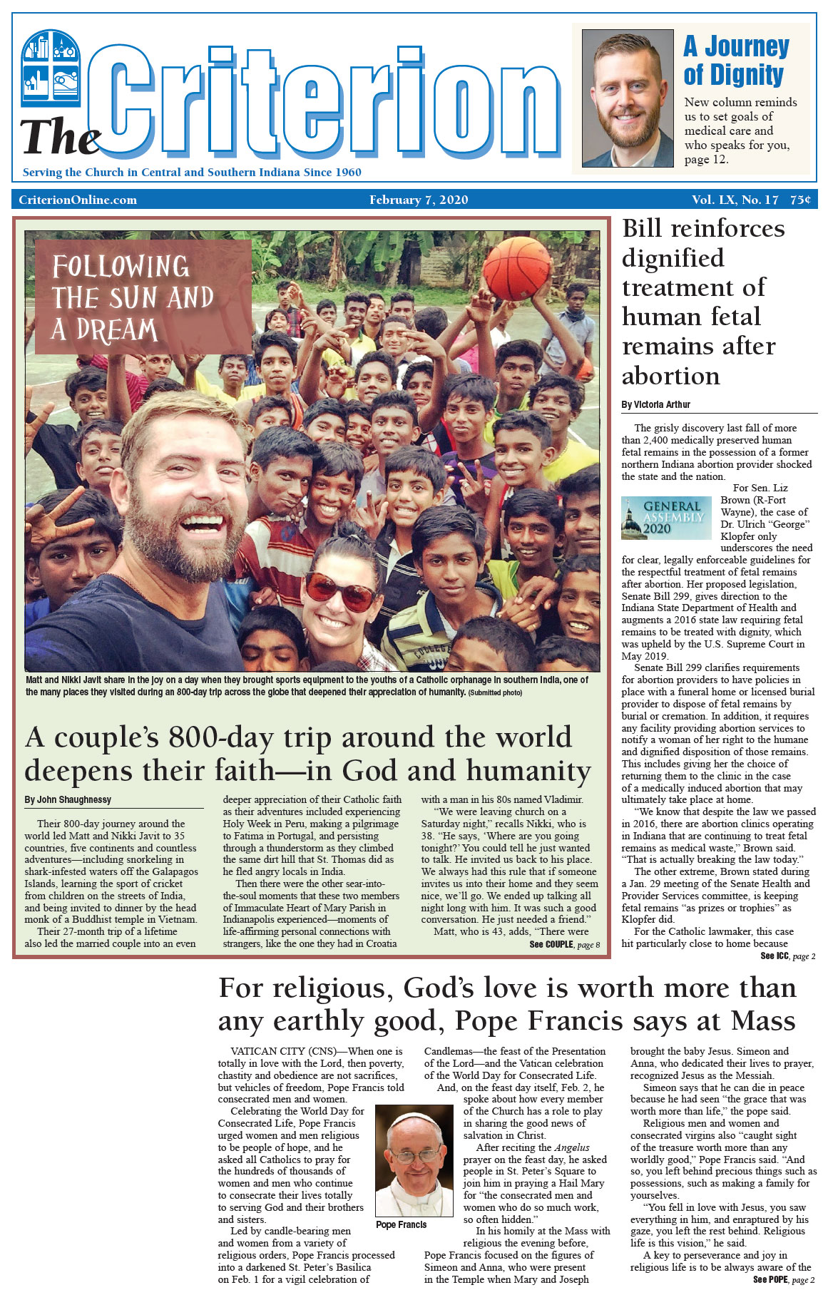 The latest edition of The Criterion has been printed and is on its way to subscribers. Below is a list of stories that will be appearing in the issue, along with regular features like the archbishop's column, the editorial page and our events calendar.