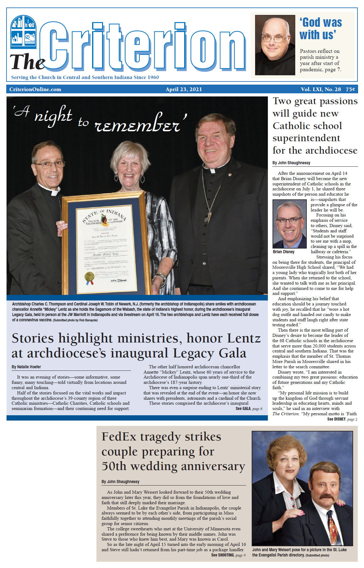 The latest edition of The Criterion has been printed and is on its way to subscribers. Below is a list of stories that will be appearing in the issue, along with regular features like the archbishop's column, the editorial page and our events calendar.