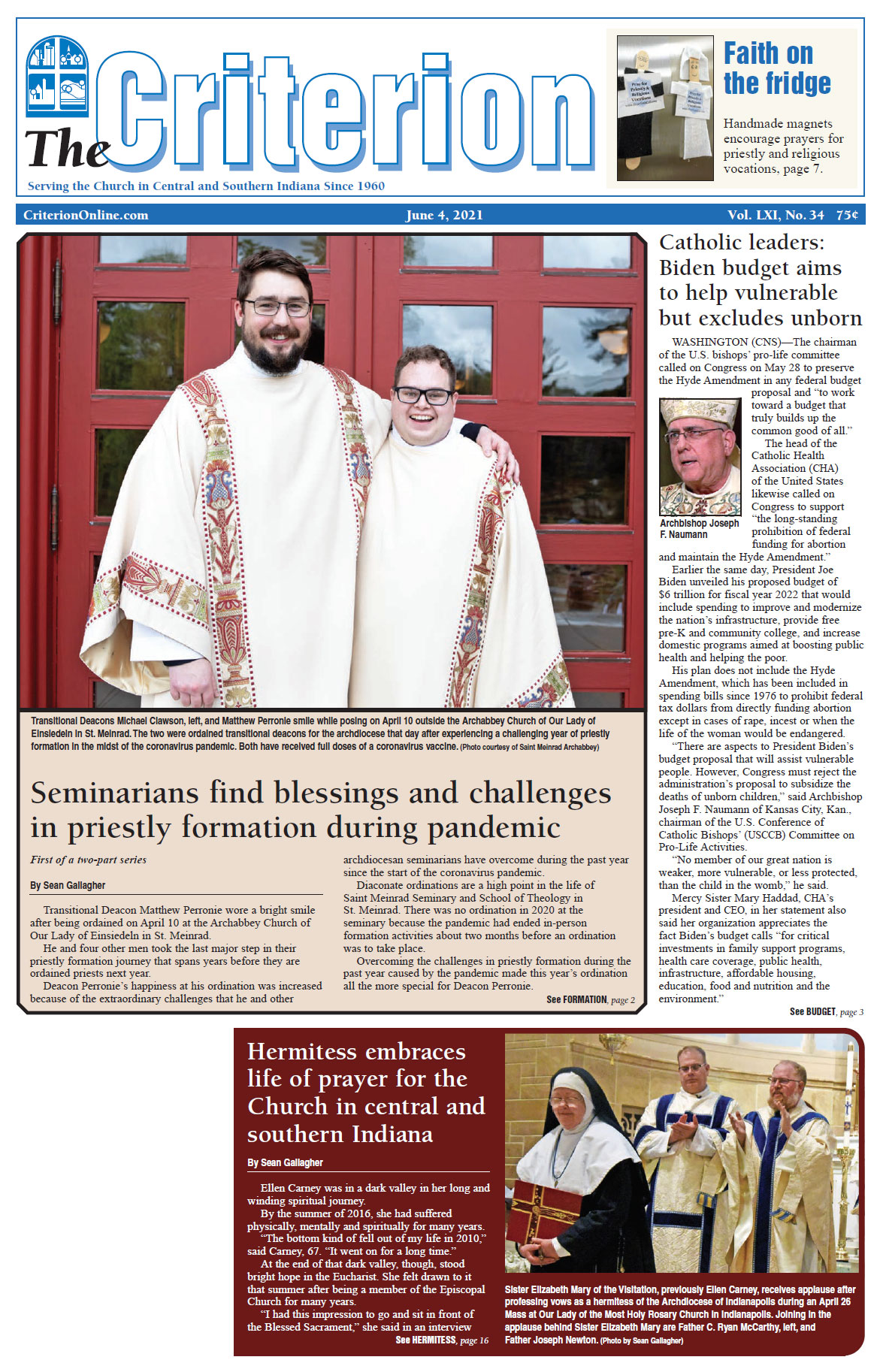The latest edition of The Criterion has been printed and is on its way to subscribers. Below is a list of stories that will be appearing in the issue, along with regular features like the archbishop's column, the editorial page and our events calendar.