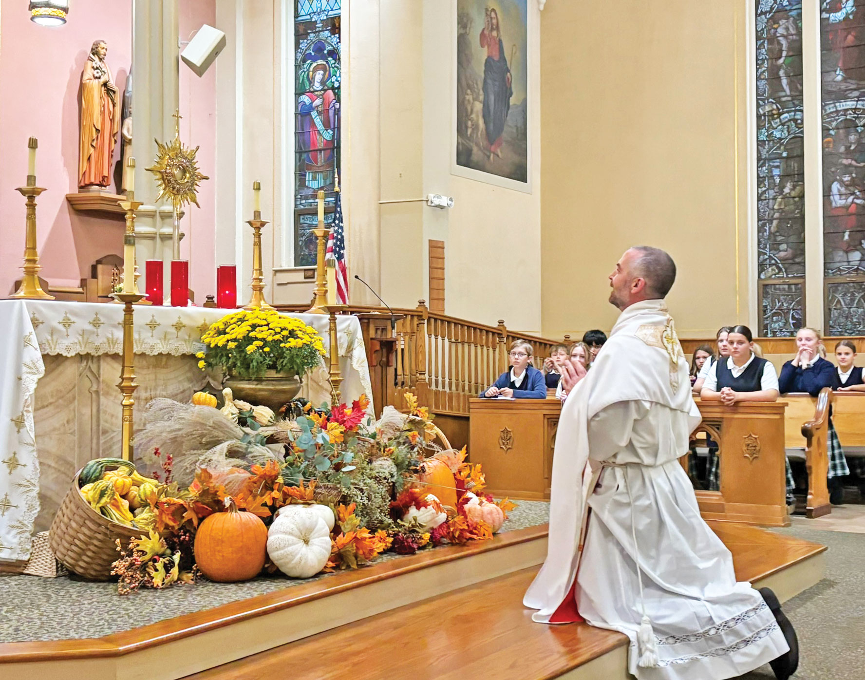 Father Dustin Boehm and students at St. Gabriel School in Connersville kneel during eucharistic adoration on Oct. 7 in St. Gabriel Church. (Photo by Mary King)