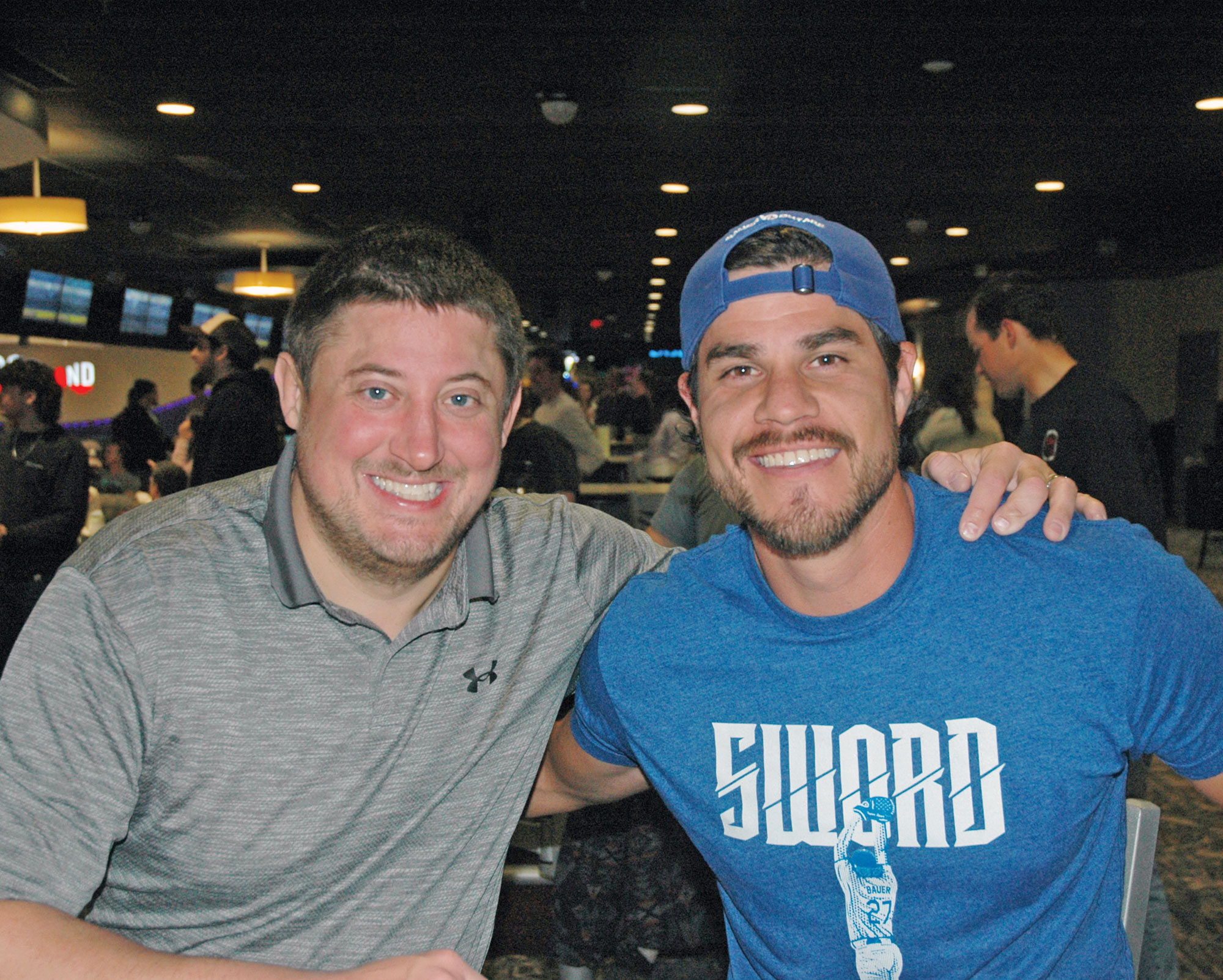 More than great friends and bowling teammates, Andrew Moster, left, served as the sponsor for Thomas Robbins as he was received into the full communion of the Church earlier this year. (Photo by John Shaughnessy)