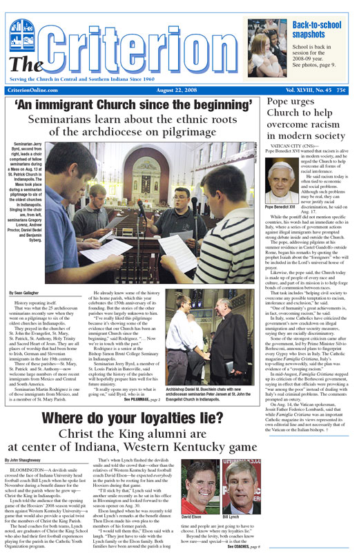 This is the sixth and last in a series featuring the winners of the 2008 Indianapolis Serra Club Vocations Essay Contest. The author, Kirk Meyers, and his parents, Mark and Annette Meyers, are members of Annunciation Parish in Brazil. Last spring, he completed the 12th grade as a home-schooled student and is the 12th-grade division winner in the 2008 Indianapolis Serra Club Vocations Essay Contest. (Page 7)